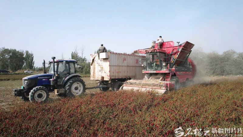 9月3日,新疆新研牧神科技无限公司自走式辣椒收成机正在焉耆回族自治县进行辣椒收成功课。周叙杰 摄!