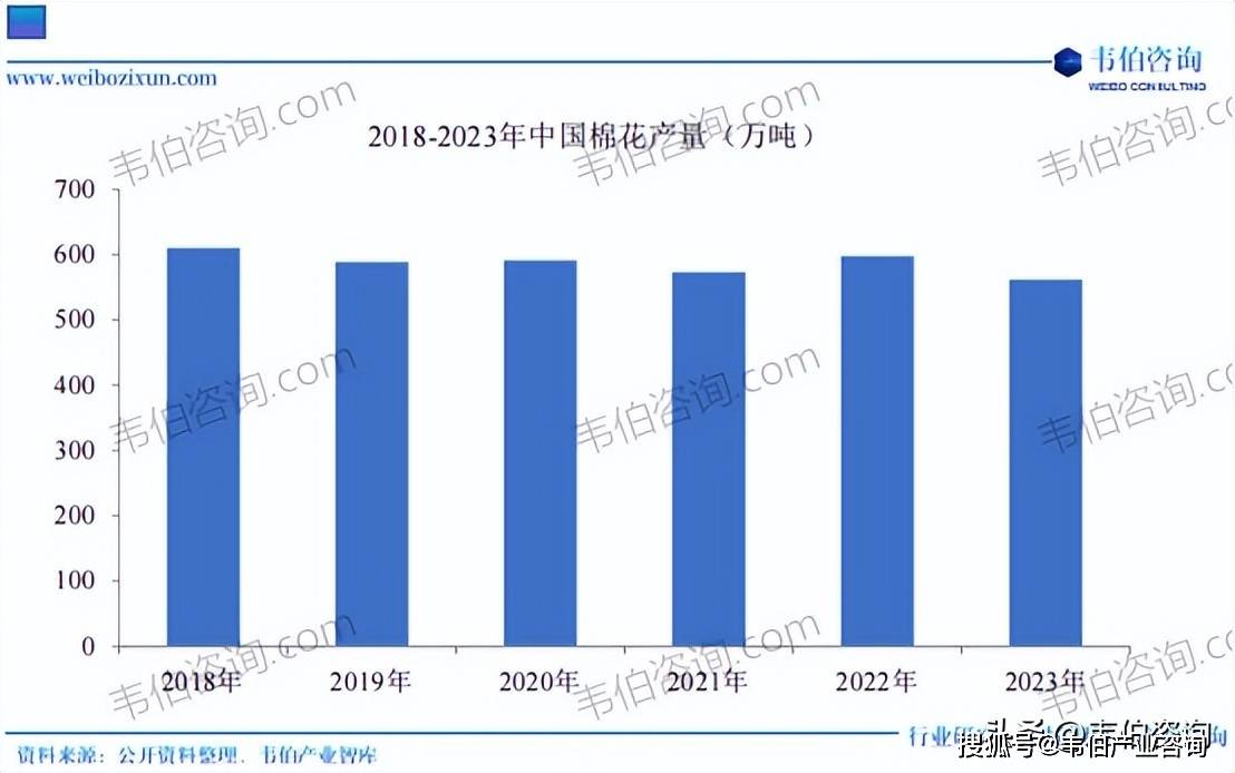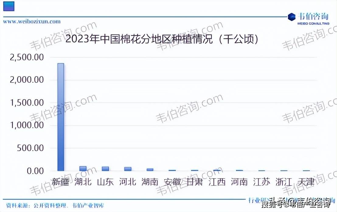 近年来,我国棉花产量规模连结相对不变的成长态势,同时,受棉花种植面积、天然等要素的影响,棉花全体产量也存正在必然的波动,按照国度统计局的统计数据,2023年中国棉花产量为561。80万吨,同比下降6。06%。我国棉花种植向劣势产区集中趋向较着,此中新疆地域种植面积处于国内绝对领先地位,2023年新疆棉花种植面积3,553。96万亩,占比84。98%,湖北、山东、分处二至四位,种植面积合计占比为10。25%。其他省市地域棉花种植面积规模较小。